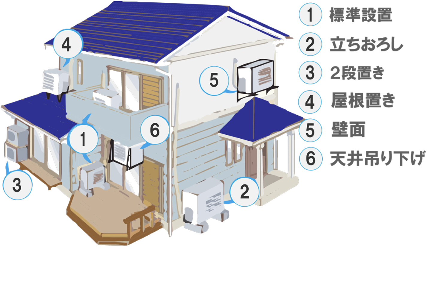 エアコンを取り付ける場所は、ご自宅環境や集合住宅の環境によってさまざまなパターンがあります。 その中でも一般的な家庭用壁掛けタイプのルームエアコンの場合を紹介します。